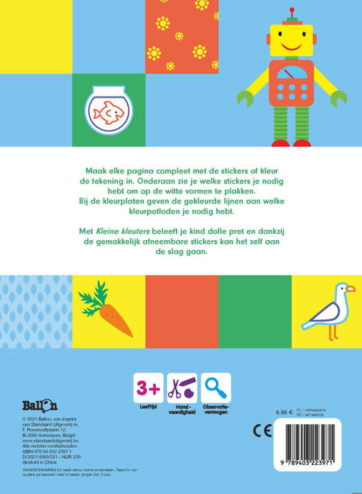 Keileuk stickerboek met meer dan 550 sticker voor 3-jarigen. Maak elke pagina compleet met de stickers of kleur de tekening in. Onderaan zie je welke stickers je nodig hebt om op de witte vormen te plakken. Bij de kleurplaten geven de gekleurde lijnen aan welke kleurpotloden je nodig hebt. Met Kleine kleuters beleeft je kind dolle pret en dankzij de gemakkelijk afneembare stickers kan het zelf aan de slag gaan.
