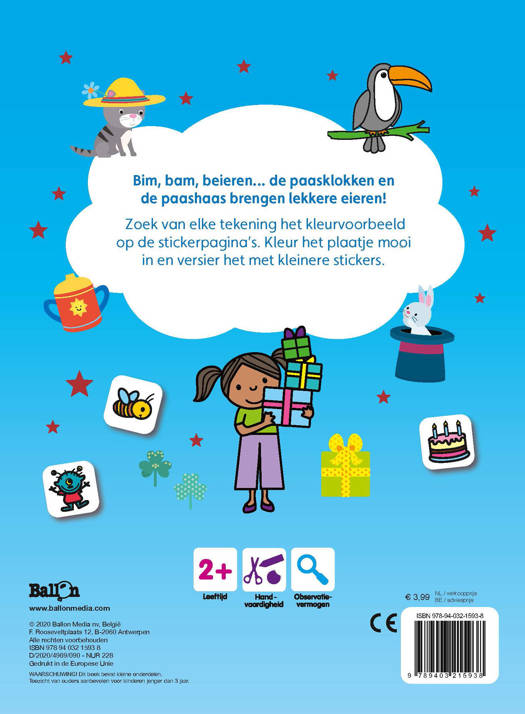 Bim, bam, beieren… de paasklokken en de paashaas brengen lekkere eieren! Zoek van elke tekening het kleurvoorbeeld op de stickerpagina‘s. Kleur het plaatje mooi in en versier het met kleinere stickers.