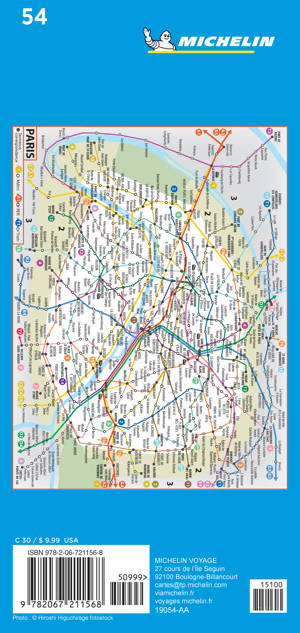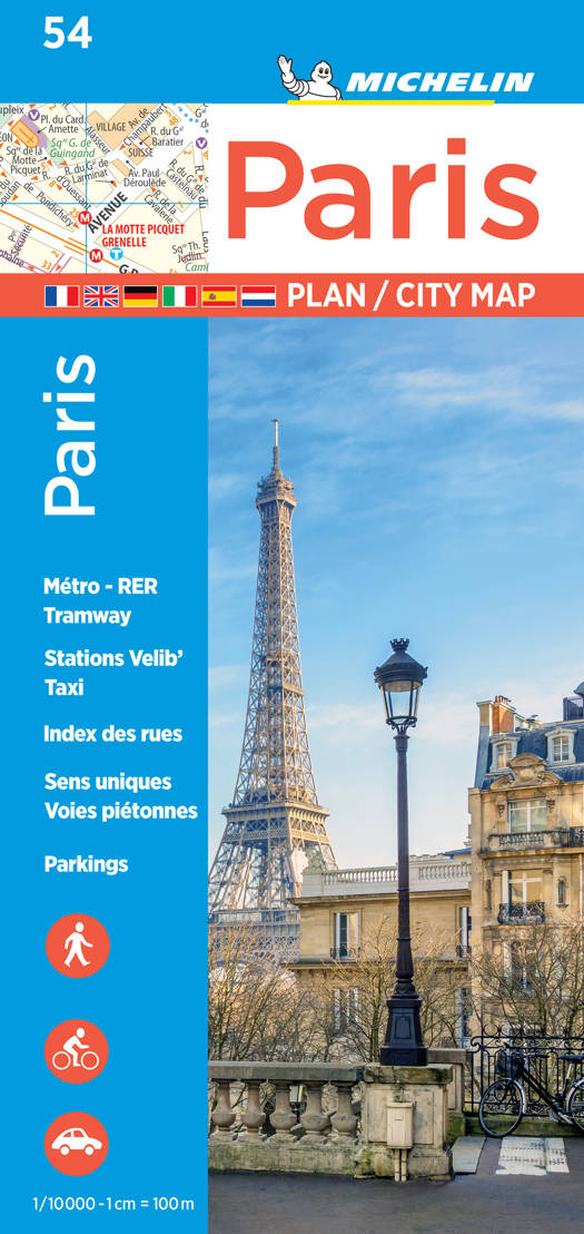 Un plan au 1:20.000 qui indique les sens uniques, les stations Vélib', les parkings et comporte un plan de métro, etc.
