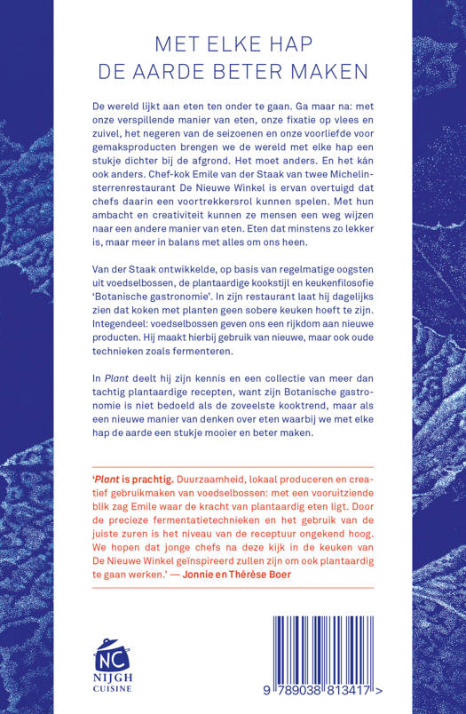 ‘Plant is prachtig. Duurzaamheid, lokaal produceren en creatief gebruik maken van voedselbossen: met een vooruitziende blik zag Emile waar de kracht van plantaardig eten ligt. Door de precieze fermentatietechnieken en het gebruik van de juiste zuren is het niveau van de receptuur ongekend hoog. We hopen dat jonge chefs na deze kijk in de keuken van De Nieuwe Winkel geïnspireerd zullen zijn om ook plantaardig te gaan werken.’ — Jonnie en Thérèse Boer