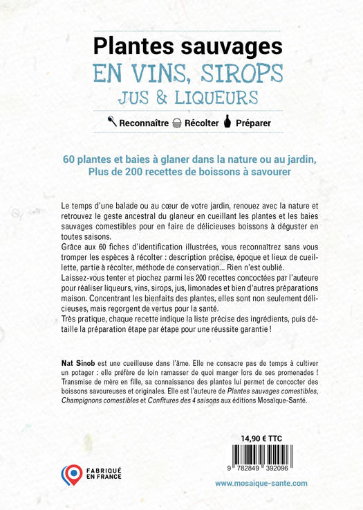 Deux livres en un : un guide de reconnaissance des plantes + un livre de recettes. Grâce aux 60 fiches d’identification et à leurs 200 illustrations, vous reconnaîtrez sans vous tromper les espèces à récolter : description précise, époque et lieux de cueillette, partie à récolter, méthode de conservation... Rien n’est oublié. Laissez-vous tenter et piochez parmi les 160 recettes concoctées par l’auteure pour réaliser liqueurs, vins, sirops, jus, limonades et bien d’autres préparations maison. Concentrant les bienfaits des plantes, elles sont non seulement délicieuses, mais regorgent de vertus pour la santé, tel le vin de sauge, tonique et antiseptique intestinal, ou encore la liqueur de sapin, excellente pour les bronches. Très pratique, chaque recette indique la liste précise des ingrédients et le matériel nécessaire, puis détaille la préparation étape par étape pour une réussite garantie ! Retrouvez également tous les conseils pour être un bon glaneur : législation, précautions à prendre, les bons accessoires, etc.