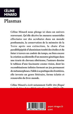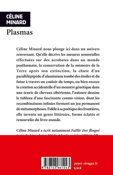 Céline Minard nous plonge dans un univers renversant, où les espèces et les genres s'enchevêtrent, le réel et le virtuel communiquent par des fils ténus et invisibles. Qu'elle décrive les mesures sensorielles effectuées sur des acrobates dans un monde posthumain, la conservation de la mémoire de la Terre après son extinction, la chute d'un parallélépipède d'aluminium tombé des étoiles et du futur à travers un couloir du temps, ou bien encore la création accidentelle d'un monstre génétique dans une écurie de chevaux sibérienne, l'auteure dessine le tableau d'une fascinante cosmo-vision, dont les recombinaisons infinies forment un jeu permanent de métamorphoses. Fidèle à sa poétique des frontières, elle invente, ce faisant, un genre littéraire, forme éclatée et renouvelée du livre-monde.