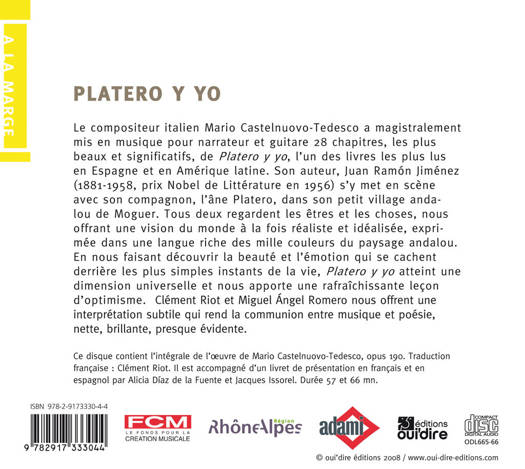 Le compositeur italien Mario Castelnuovo-Tedesco a magistralement mis en musique pour narrateur et guitare 28 chapitres, les plus beaux et significatifs, de Platero y yo , l'un des livres les plus lus en Espagne et en Amérique latine. Son auteur, Juan Ramón Jiménez (1881-1958, prix Nobel de Littérature en 1956) s'y met en scène avec son compagnon, l'âne Platero, dans son petit village andalou de Moguer. Tous deux regardent les êtres et les choses, nous offrant une vision du monde à la fois réaliste et idéalisée, exprimée dans une langue riche des mille couleurs du paysage andalou. En nous faisant découvrir la beauté et l'émotion qui se cachent derrière les plus simples instants de la vie, Platero y yo atteint une dimension universelle et nous apporte une rafraîchissante leçon d'optimisme. Clément Riot et Miguel Ángel Romero nous offrent une interprétation subtile qui rend la communion entre musique et poésie, nette, brillante, presque évidente.