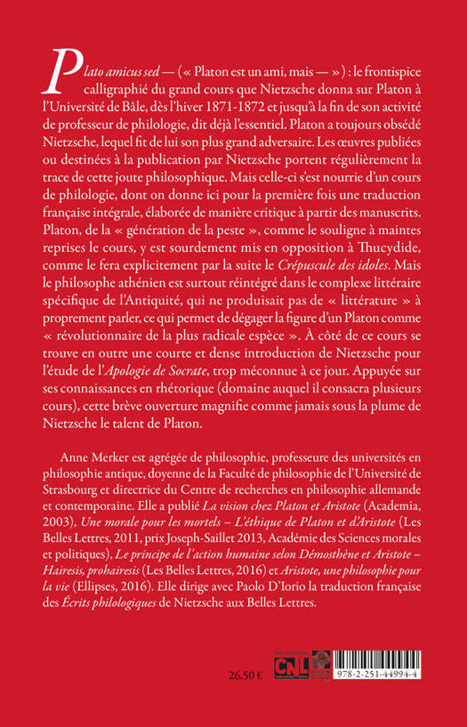 Plato amicus sed - (Platon est un ami, mais -): le frontispice calligraphie du grand cours que Nietzsche donna sur Platon a l'Universite de Bale, des l'hiver 1871-1872 et jusqu'a la fin de son activite de professeur de philologie, dit deja l'essentiel. Platon a toujours obsede Nietzsche, lequel fit de lui son plus grand adversaire. Les oeuvres publiees ou destinees a la publication par Nietzsche portent regulierement la trace de cette joute philosophique. Mais celle-ci s'est nourrie d'un cours de philologie, dont on donne ici pour la premiere fois une traduction francaise integrale, elaboree de maniere critique a partir des manuscrits. Platon, de la generation de la peste , comme le souligne a maintes reprises le cours, y est sourdement mis en opposition a Thucydide, comme le fera explicitement par la suite le Crepuscule des idoles. Mais le philosophe athenien est surtout reintegre dans le complexe litteraire specifique de l'Antiquite, qui ne produisait pas de litterature a proprement parler, ce qui permet de degager la figure d'un Platon comme revolutionnaire de la plus radicale espece . A cote de ce cours se trouve en outre une courte et dense introduction de Nietzsche pour l'etude de l'Apologie de Socrate, trop meconnue a ce jour. Appuyee sur ses connaissances en rhetorique (domaine auquel il consacra plusieurs cours), cette breve ouverture magnifie comme jamais sous la plume de Nietzsche le talent de Platon.