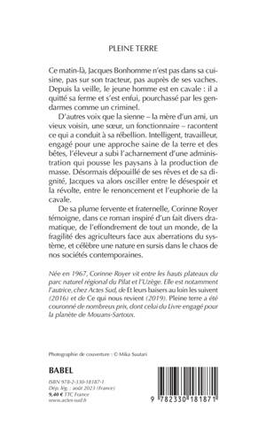 Ce matin-là, Jacques Bonhomme n'est pas dans sa cuisine, pas sur son tracteur, pas auprès de ses vaches. Depuis la veille, le jeune homme est en cavale : il a quitté sa ferme et s'est enfui, pourchassé par les gendarmes comme un criminel. D'autres voix que la sienne - la mère d'un ami, un vieux voisin, une soeur, un fonctionnaire - racontent ce qui a conduit à sa rébellion. Intelligent, travailleur, engagé pour une approche saine de la terre et des bêtes, l'éleveur a subi l'acharnement d'une administration qui pousse les paysans à la production de masse. Désormais dépouillé de ses rêves et de sa dignité, Jacques va alors osciller entre le désespoir et la révolte, entre le renoncement et l'euphorie de la cavale. De sa plume fervente et fraternelle, Corinne Royer témoigne, dans ce roman inspiré d'un fait divers dramatique, de l'effondrement de tout un monde, de la fragilité des agriculteurs face aux aberrations du système, et célèbre une nature en sursis dans le chaos de nos sociétés contemporaines.