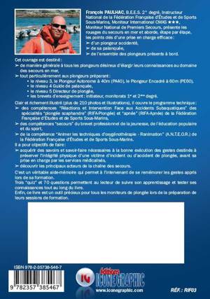 Clair et richement illustré (plus de 160 photos et illustrations), il couvre le programme : - de l'attestation "réactions et intervention face à un accident de plongée" (R.I.F.A.P.) de la Fédération Française d'Etudes et de Sports Sous-Marins ; - du module 3 "les secours" de la formation modulaire du Brevet d'Etat d'Educateur Sportif 1er degré option Plongée Subaquatique. SOMMAIRE : 1 détecter une situation anormale en plongée / 2 mettre le plongeur accidenté en sécurité / 3 récupérer les autres plongeurs / 4 gérer l’accident de plongée sur le bateau / 5 réaliser le bilan et détecter un malaise / 6 connaître le matériel de sécurité / 7 prendre en charge un plongeur accidenté en attendant l’équipe médicalisée / 8 connaître les acteurs du secours en mer / 9 connaître les acteurs du secours à terre / 10 donner l’alerte / 11 évacuer le plongeur accidenté / 12 remplir les formalités après l’accident / 13 réglementation nationale sur le secours maritime / bonus, quizz n°1, quizz n°2, quizz n°3, fiche d’évacuation de plongeur (medsubhyp / f.f.e.s.s.m.), solution des quizz / 148 pages