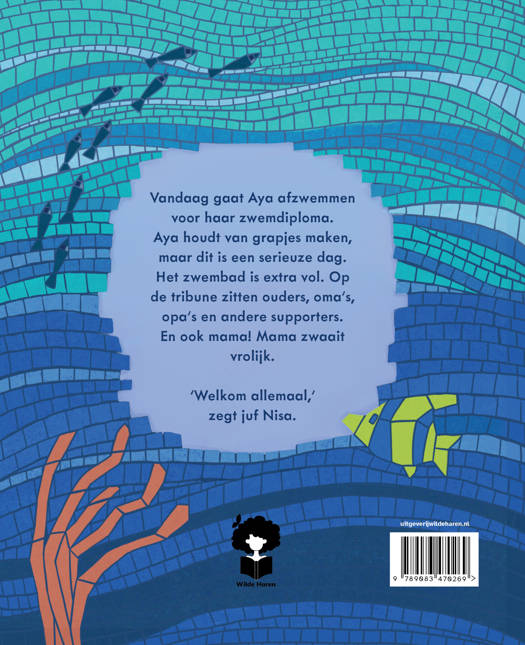Vandaag gaat Aya afzwemmen voor haar zwemdiploma. Aya houdt van grapjes maken, maar dit is een serieuze dag. Het zwembad is extra vol. Op de tribune zitten ouders, oma's, opa's en andere supporters. En ook mama! Mama zwaait vrolijk. 'Welkom allemaal, zegt juf Nisa.