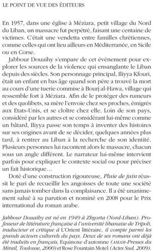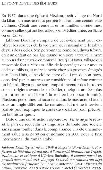 Doté d'une construction rigoureuse, «Pluie de juin» réussit le pari de recueillir les angoisses de toute une société sans jamais tomber dans la complaisance. Il a été unanimement salué à sa parution et nominé en 2008 pour le Prix international du roman arabe.