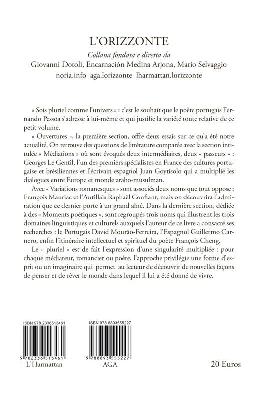 « Sois pluriel comme l’univers » : c’est le souhait que le poète portugais Fernando Pessoa s’adresse à lui-même et qui justifie la variété toute relative de ce petit volume. « Ouvertures », la première section, offre deux essais sur ce qu’a été notre actualité. On retrouve des questions de littérature comparée avec la section intitulée « Médiations » où sont évoqués deux intermédiaires, deux « passeurs » : Georges Le Gentil, l’un des premiers spécialistes en France des cultures portugaise et brésiliennes et l’écrivain espagnol Juan Goytisolo qui a multiplié les dialogues entre Europe et monde arabo-musulman. Avec « Variations romanesques » sont associés deux noms que tout oppose : François Mauriac et l’Antillais Raphaël Confiant, mais on découvrira l’admiration que ce dernier porte à un grand aîné. Dans la dernière section, dédiée à des « Moments poétiques », sont regroupés trois noms qui illustrent les trois domaines linguistiques et culturels auxquels l’auteur de ce livre a consacré ses recherches : le Portugais David Mourão-Ferreira, l’Espagnol Guillermo Carnero, enfin l’itinéraire intellectuel et spirituel du poète François Cheng. Le « pluriel » est de fait l’expression d’une singularité multipliée : pour chaque médiateur, romancier ou poète, l’approche privilégie une forme d’esprit ou un imaginaire qui permet au lecteur de découvrir de nouvelles façons de penser et de rêver le monde dans lequel il lui a été donné de vivre.