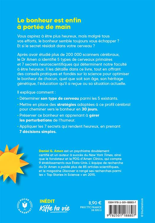 Vous aspirez à être plus heureux, mais malgré tous vos efforts, le bonheur semble toujours vous échapper ? Et si le secret résidait dans votre cerveau ? Après avoir étudié plus de 200 000 scanners cérébraux, le Dr Amen a identifié 5 types de cerveaux primaires et 7 secrets neuroscientifiques qui déterminent notre faculté à être heureux. Il les détaille dans ce livre, tout en offrant des conseils pratiques et fondés sur la science pour optimiser le bonheur de chacun, quel que soit son âge, son héritage génétique, l’éducation qu’il a reçue ou sa situation actuelle. Il explique comment : • Déterminer son type de cerveau parmi les 5 existants. • Mettre en place des stratégies adaptées à ce profil cérébral pour cheminer vers le bonheur en 30 jours. • Préserver ce bonheur en apprenant à gérer les perturbations de l’humeur. • Appliquer les 7 secrets qui rendent heureux, en prenant 7 décisions simples.