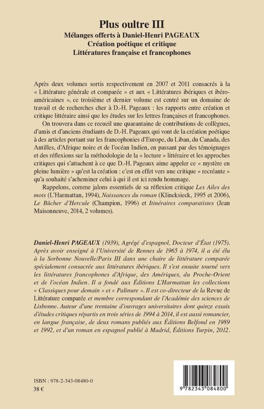 Après deux volumes sortis respectivement en 2007 et 2011 consacrés à la « Littérature générale et comparée » et aux « Littératures ibériques et ibéroaméricaines », ce troisième et dernier volume est centré sur un domaine de travail et de recherches cher à D.-H. Pageaux : les rapports entre création et critique littéraire ainsi que les études sur les lettres françaises et francophones. On trouvera dans ce recueil une quarantaine de contributions de collègues, d’amis et d’anciens étudiants de D.-H. Pageaux qui vont de la création poétique à des articles portant sur les francophonies d’Europe, du Liban, du Canada, des Antilles, d'Afrique noire et de l'océan Indien.