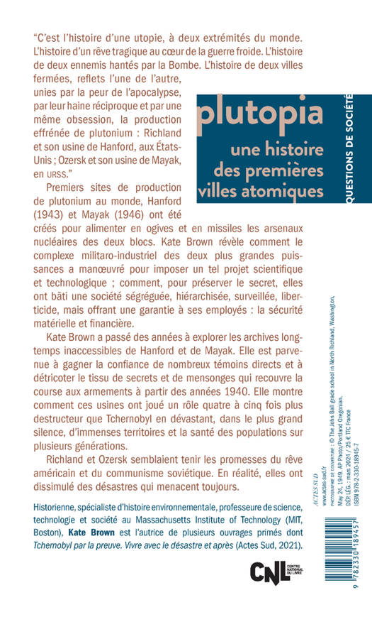 "C'est l'histoire d'une utopie, à deux extrémités du monde. L'histoire d'un rêve tragique au coeur de la guerre froide. L'histoire de deux ennemis hantés par la Bombe. L'histoire de deux villes fermées, reflets l'une de l'autre, unies par la peur de l'apocalypse, par leur haine réciproque et par une même obsession, la production effrénée de plutonium : Richland et son usine de Hanford, aux États-Unis ; Ozersk et son usine de Mayak, en URSS." Premiers sites de production de plutonium au monde, Hanford (1943) et Mayak (1946) ont été créés pour alimenter en ogives et en missiles les arsenaux nucléaires des deux blocs. Kate Brown révèle comme le complexe militaro-industriel des deux plus grandes puissances a manoeuvré pour imposer un tel projet scientifique et technologique ; comment, pour préserver le secret, elles ont bâti une société ségréguée, hiérarchisée, surveillée, liberticide, mais offrant une garantie à ses employés : la sécurité matérielle et financière. Kate Brown a passé des années à explorer les archives longtemps inaccessibles de Hanford et de Mayak. Elle est parvenue à gagner la confiance de nombreux témoins directs et à décricoter le tissu de secrets et de mensonges qui recouvre la course aux armements à partir des années 1940. Elle montre comment ces usines ont joué un rôle quatre à cinq fois plus destructeurs que Tchernobyl en dévastant, dans le plus grand silence, d'immenses territoires et la santé des populations sur plusieurs générations. Richland et Ozersk semblaient tenir les promesses du rêve américain et du communisme soviétique. En réalité, elles ont dissimulé des désastres qui menacent toujours.