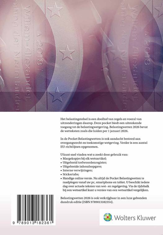 Het belastingstelsel is zeer omvangrijk. Met deze pocket heb je alle belangrijke wetgeving per januari 2026 bij de hand. Ook besteedt de titel aandacht aan Europese en internationale regelgeving. Daarnaast helpen het uitgebreide trefwoordenregister en de bijgevoegde stickertabs je om gemakkelijk te navigeren.