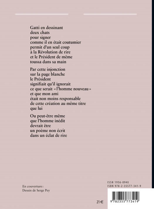 Bâtons écrits à Pékin en 2010 dans la mémoire de l’USINE 798Contribution à l’histoire de la Poésie réalisée à travers un commentaire sur le nom de Mao des citations du Tao et une évocation de la momification des chats dans l’Égypte ancienne.Notes ordonnées pour une conférence-action à l’occasion de la création de la section éphémère du collège de ’pataphysique de Pékin.Ces notes ont été conçues en hommage à Lao Tseu à l’aide de cut-ups réalisés à partir de Wikipédia et du Tao réécrits.Texte à lire avec en fond sonore des enregistrements de miaulement de chat.À Chiara Mulas sur le long chemin à travers les soldats de l’armée de terre cuite de Xi an À Armand Gatti en souvenir de son dialogue avec Mao-Tsé-Toung