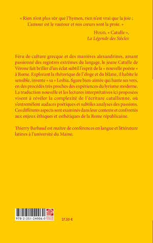 Rien n'est plus sur que l'hymen, rien n'est vrai que la joie; L'amour est le vautour et nos coeurs sont la proie. Hugo, Catulle, La Legende des Siecles Feru de culture grecque et des manieres alexandrines, amant passionne des registres extremes du langage, le jeune Catulle de Verone fait briller d'un eclat subtil l'esprit de la nouvelle poesie a Rome. Explorant la rhetorique de l'eloge et du blame, il habite le sensible, invente sa Lesbia, figure bien-aimee qui hante ses vers, en des procedes tres proches des experiences du lyrisme moderne. La traduction nouvelle et les lectures interpretatives ici proposees visent a reveler la complexite de l'ecriture catullienne, ou s'entremelent audaces poetiques et subtiles analyses des passions. Ces differents aspects sont examines dans leur contexte et confrontes aux enjeux ethiques et esthetiques de la Rome republicaine. Thierry Barbaud est Maitre de conferences en langue et litterature latine a l'Universite du Maine.