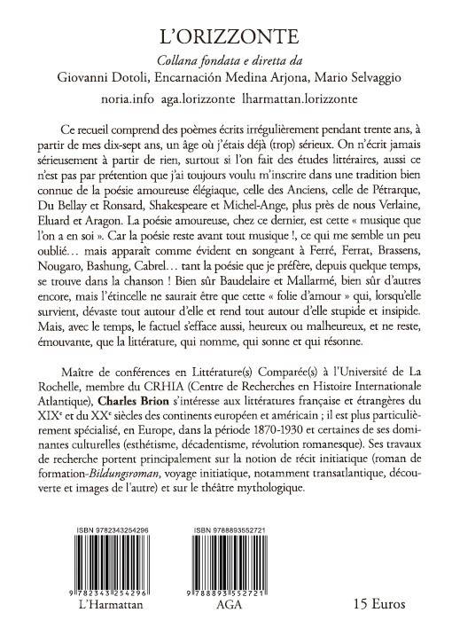 Ce recueil comprend des poèmes écrits irrégulièrement pendant trente ans, à partir de mes dix-sept ans, un âge où j'étais déjà sérieux. On n'écrit jamais sérieusement à partir de rien, surtout si l'on fait des études littéraires, aussi ce n'est pas par prétention que j'ai toujours voulu m'inscrire dans une tradition bien connue de la poésie amoureuse élégiaque, celle des Anciens, celle de Pétrarque, Du Bellay, Shakespeare et Michel-Ange, plus près de nous Verlaine, Éluard et Aragon. La poésie amoureuse, chez ce dernier, est cette « musique que l'on a en soi ». Car la poésie reste avant tout musique !, ce qui me semble un peu oublié... mais apparaît comme évident en songeant à Ferré, Ferrat, Brassens, Nougaro, Bashung, Cabrel... tant la poésie que je préfère, depuis quelque temps, se trouve dans la chanson ! Bien sûr Baudelaire et Mallarmé, bien sûr d'autres encore, mais l'étincelle ne saurait être que cette « folie d'amour » qui, lorsqu'elle survient, dévaste tout autour d'elle et rend tout autour d'elle stupide et insipide. Mais, avec le temps, le factuel s'efface aussi, heureux ou malheureux, et ne reste que la littérature, qui nomme, qui sonne et qui résonne.