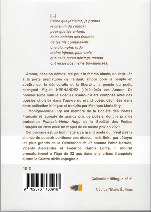 Miguel Hernández vint au monde avec trois blessures : la vie, l’amour et la mort. Comme en témoigne sa poésie, malgré les tourments de l’existence, les liens de l’amour sont restés de loin les plus forts. La poésie de Miguel Hernández est Amour pour la femme, le fils, la nature de son enfance. Sa poésie est également solidarité vis-à-vis du peuple en souffrance. Ses vers sont le témoignage d’un cœur droit, sensible, fidèle à ses convictions. Le poète assumera les coups assénés dans son enfance par son père pour qu’il cesse de lire, l’arrêt prématuré de ses études, la mort de son premier fils, la distance de la femme aimée, la torture et les longs mois de réclusion dans des prisons successives lors de la Guerre civile espagnole. Dans ce premier tome de Poèmes d’amour dédié au grand poète, la traductrice Monique-Marie Ihry a fait une sélection judicieuse de textes déclinant ce thème dans son ensemble. Une préface détaillée présente la vie et l’œuvre du grand poète mort prématurément à l’âge de 32 ans.