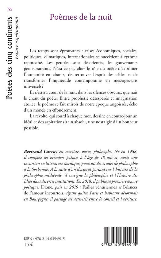 Les temps sont éprouvants : crises économiques, sociales, politiques, climatiques, internationales se succèdent à rythme rapproché. Les peuples sont désorientés, les gouvernants peu rassurants. N'est-ce pas alors le rôle du poète d'exprimer l'humanité en chants, de retrouver l'esprit des aèdes et de transformer l'inquiétude contemporaine en messages-cris universels ? Et c'est au cur de la nuit, dans les silences obscurs, que naît le chant du poète. Entre prophétie désespérée et imagination étoilée, le poème se fait miroir de notre époque angoissée, écho d'un monde en effondrement. La révolte, qui sourd à chaque mot, dessine en contre-jour un idéal et des aspirations à un absolu, une nostalgie d'un bonheur possible.