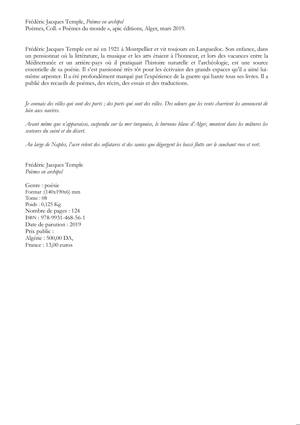 SEPT QUESTIONS A FREDERIC JACQUES TEMPLE1/ Une autobiographie en quelques mots.Né à Montpellier en 1921, en plein mois d’août, un matin d’orage, j’ai passé ma jeunesse entre le Larzac ancestral et les marais en bordure de la mer où je jouais avec les dauphins. J’ai passé de nombreuses et grandes heures dans les roselières avec les oiseaux migrateurs, parmi les arbustes et chardons des Grands Causses, dans les grottes et les avens. Les années scolaires m’ont permis de parler grec et latin, de chanter le grégorien, de jouer au football, de jardiner et de puiser dans les armoires à livres du pensionnat pour découvrir Jules Verne, Chateaubriand, Jack London, Homère, Saadi, Fenimore Cooper, Omar Khayyâm ou François Villon. Ce fut ensuite, en 1942, l’Algérie et la découverte du grand désert, mon rêve obsessionnel depuis la lecture du Méharées de Théodore Monod ; la guerre, de 1943 à 1945, en Tunisie, Italie, France et Allemagne qui m’isola du monde ; puis le Maroc en 1947, pour un journalisme éphémère ; de 1948 à 1954, agent commercial d’une compagnie pétrolière ; et enfin, responsable pour le Languedoc-Roussillon de la Radio et de la Télévision. J’ai voyagé : séjours au Québec, aux États-Unis, au Mexique, au Brésil ; nomadisme dans toute l’Europe et en Algérie, Maroc, Cap Vert… En 2008, j’ai quitté ma ville natale pour un village entouré d’oliviers. Dans le jardin, se plaignent des tourterelles, folâtrent mésanges, bergeronnettes et rouges-queues, se traîne allègrement une tortue sous le regard ébahi d’un chat éthiopien.2/ Comment répondre à une injonction brusque : « Définissez la poésie. »La bonne réponse, la plus courte, on la doit à un poète britannique, Robert Browning, je crois : Si on ne me le demande pas, je le sais ; si on me le demande, je ne le sais plus. On peut citer aussi Walt Whitman qui déclare dans son Journal : Je n’aurai pas la témérité, ici ni ailleurs, dans un but personnel ou dans quelque but que ce soit, de chercher à définir la poésie, répondre à la question : Qu’est-ce que la poésie ? … Aucune des définitions qui en ont été offertes n’embrasse suffisamment, à mon avis, le mot Poésie. J’ai répondu, voilà déjà longtemps, que si j’écris de la poésie, c’est, faute de mieux, pour trouver un refuge, pour remplacer un paradis condamné dès l’aube du temps à être perdu.3/ Prose et poésie, la distinction a-t-elle un sens ?Avant de recevoir l’alphabet, donc de lire et d’écrire, l’homme, qui n’était pas encore sapiens, bredouillait, hurlait, chantait, gémissait. La musique de la voix était son premier moyen d’expression, avec la peinture. L’oral fut longtemps souverain. L’écriture vint donner une forme à la voix, pour transmettre et conserver les fruits de l’esprit. Pour soutenir la mémoire, l’aède inventa la versification, c’est-à-dire la règle, la cadence, le rythme, pour le meilleur et pour le pire. La prose vint cohabiter avec la poésie. Il y eut des mariages, des métis, à l’insu ou non des parents, et souvent à contre-cœur. Le vers devenant une prose au pas cadencé, la prose empruntant à la poésie un plus haut langage.4/ De la forme (et du formel) en temps de crise.La crise n’est-elle pas l’état constant en ce monde ? Que ce soit en économie, en géopolitique ou en littérature. Si on oubliait les préoccupations formelles en temps de crise au profit de préoccupations « plus urgentes » il n’y aurait plus de poésie, ni d’art en général depuis longtemps. De toute façon, c’est la forme qui fait le fond.5/ Quel avenir pour la poésie ?L’avenir de la poésie est lié à celui de la Terre, à moins qu’elle soit présente dans un autre coin de l’univers. Notre planète finira par exploser dans la profondeur de l’abîme du temps. Ce sera « adieu » et non « au-revoir ». On peut lire, souvent, dans des revues et des journaux ce genre de question : La poésie sauvera-t-elle le monde ? Ou, ce qui est pire, cette phrase imbue de son bien fondé : La poésie sauvera le monde. Elle aurait pu le faire depuis des milliers d’années. Comme je l’ai déjà dit plus haut, ce sont les humains qui ont inventé la poésie, faute de mieux, et elle partage leur destin. 6/ La part de la prosodie dans l’élaboration du poème.La prosodie est essentielle pour moi, puisqu’il s’agit de rythme et de mélodie et que je travaille surtout à l’oreille. Mais si l’on veut donner un sens plus contraignant à ce terme, alors je m’en désolidarise.7/ La place de la traduction dans l’écriture poétique.D’abord, écrire c’est traduire, se traduire. La main, ce merveilleux instrument, matérialise et fixe ce que lui fournit l’esprit. Et si on traduit ce que les autres écrivent dans le monde entier, c’est pour ouvrir des routes inconnues, et aussi pour se retrouver ailleurs autrement, comparer, emprunter, échanger. Ainsi, lorsque je traduis un poète étranger, je puise dans sa langue de quoi abreuver la mienne, au point de pouvoir affirmer que le poème que j’ai traduit est devenu le mien puisqu’il est désormais dans ma langue, donc un texte original. Et s’il arrivait que le poète en question traduise ma version de son poème, cela donnerait encore une œuvre nouvelle.