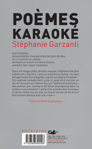 Dans une langue drôle, décalée, enjouée, Stéphanie Garzanti explore les cinq sens - plus un sixième en bonus - et vous fait apprivoiser les araignées, parler aux fleurs et chanter... Ces poèmes karaoké sont aussi et peut-être surtout un recueil sensuel sur l'amour fou, sur l'attente et la distance ; des poèmes qui, comme le dit Elitza Gueorguieva dans sa préface, nous donnent « envie d'en prendre des morceaux et de les coller sur un mur, ou mieux encore de les écrire directement dessus avec une craie ».