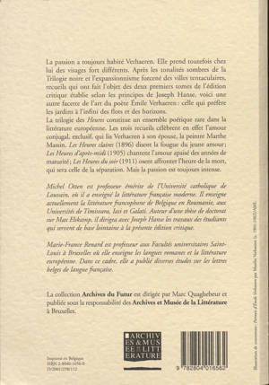 Les Heures claires (1896) disent la fougue du jeune amour ; Les Heures d’après-midi (1905) chantent l’amour apaisé des années de maturité ; Les Heures du soir (1911) osent affronter l’heure de la mort, qui sera celle de la séparation."