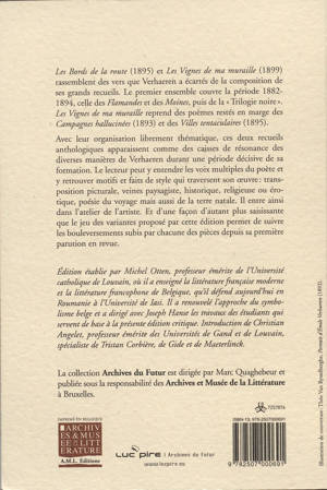 "Ces deux recueils anthologiques apparaissent comme des caisses de résonance des diverses manières de Verhaeren durant une période décisive de sa formation. Le lecteur peut y entendre les voix multiples du poète et y retrouver les motifs et les faits de style qui traversent son œuvre : transposition picturale, veines paysagiste, historique, religieuse ou érotique, poésie du voyage, mais aussi de la terre natale. Il entrera ainsi dans l’atelier de l’artiste, et d’une façon d’autant plus saisissante que le jeu des variantes proposé par cette édition permet de suivre les bouleversements subis par chacune des pièces depuis leur parution en revue."