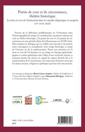 Partant de la définition problématique de l'événement dans l'historiographie du temps, les contributions au présent volume ont trait au théâtre historique, à la poésie de cour et à la poésie de circonstance sur une période allant de la Renaissance au XVIIIe siècle. Elles étudient le dialogue qui s'établit entre factuel et fictionnel, entre contingence et exemplarité, entre temps historique et temps de l'écriture ou de la représentation.