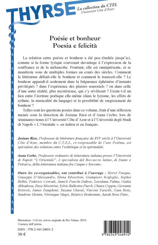 La relation entre poésie et bonheur a été peu étudiée jusqu'ici, comme si la forme lyrique convenait davantage à l'expression de la souffrance et de la mélancolie. Pourtant, elle est omniprésente, et se manifeste sous de multiples formes au cours des siècles. Comment la littérature définit-elle le bonheur ? Le bonheur apparaît-il seulement dans la fulgurance éphémère d'instants privilégiés ? ou dans celle d'une autre réalité, plus mystérieuse, qui s'y révèlerait ? Existe-t-il un lien entre l'écriture poétique elle-même et la possibilité de surgissement du bonheur ? Telles sont les questions posées dans ce volume, fruit d'une réflexion menée sous la direction de Josiane Rieu et d'Anna Cerbo.