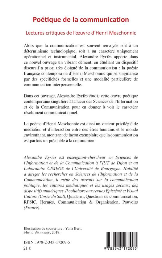 Alexandre Eyriès apporte dans cet ouvrage un vibrant démenti en étudiant un dispositif discursif a priori très éloigné de la communication : la poésie française contemporaine d'Henri Meschonnic qui se singularise par des spécificités formelles et une modalité particulière de communication interpersonnelle. Il étudie cette uvre poétique à la lueur des Sciences de l'Information et de la Communication pour en donner à voir le caractère résolument communicationnel. Le poème d'Henri Meschonnic est un vecteur privilégié de médiation et d'interaction entre des êtres humains et le monde environnant, montrant que la communication est parfois un préalable à la communion.