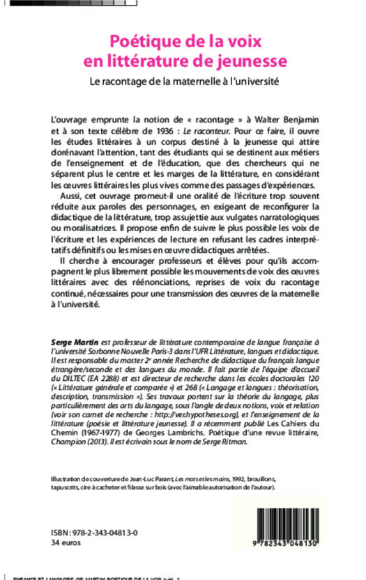 L'ouvrage emprunte la notion de "racontage" à Walter Benjamin et à son texte célèbre de 1936 : Le raconteur. Pour ce faire, il ouvre les études littéraires à un corpus destiné à la jeunesse. Aussi, cet ouvrage promeut-il une oralité de l'écriture trop souvent réduite aux paroles des personnages, en exigeant de reconfigurer la didactique de la littérature, trop assujettie aux vulgates narratologiques ou moralisatrices. Il propose enfin de suivre le plus possible les voix de l'écriture et les expériences de lecture en refusant les cadres interprétatifs définitifs.