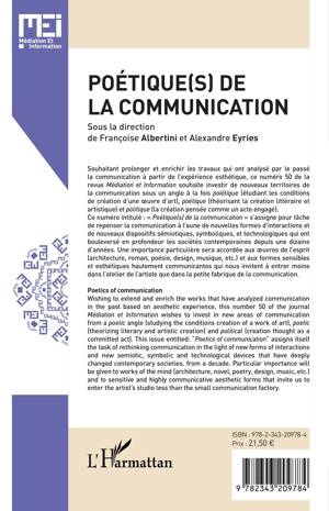 Ce numéro intitulé : « Poétique(s) de la communication» s'assigne pour tâche de repenser la communication à l'aune de nouvelles formes d'interactions et de nouveaux dispositifs sémiotiques, symboliques, et technologiques qui ont bouleversé en profondeur les sociétés contemporaines depuis une dizaine d'années. Une importance particulière sera accordée aux oeuvres de l'esprit (architecture, roman, poésie, design, musique, etc.) et aux formes sensibles et esthétiques hautement communicantes qui nous invitent à entrer moins dans l'atelier de l'artiste que dans la petite fabrique de la communication.