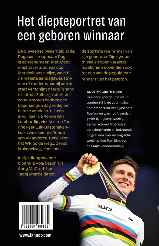 De Sloveense wielerheld Tadej Pogačar - roepnaam Pogi - is een fenomeen. Met groot machtsvertoon, vaak op Merckxiaanse wijze, weet hij de meeste eendagswedstrijden of rondes waar hij aan de start verschijnt naar zijn hand te zetten. Zelfs zijn sterkste concurrenten hebben een begenadigde dag nodig om hem te verslaan. Hij won al vijf keer de Ronde van Lombardije, vier keer de Tour, drie keer Luik-Bastenaken-Luik, twee keer de Ronde van Vlaanderen, twee keer het WK op de weg... De lijst is simpelweg eindeloos. In zijn diepgravende biografie Pogi beschrijft Andy McGrath hoe Tadej uitgroeide tot de sterkste wielrenner van zijn generatie. Zijn sympathieke en open karakter maakt hem bovendien ook tot een van de populairste renners van het peloton.