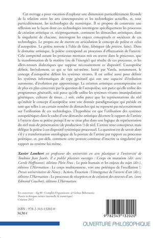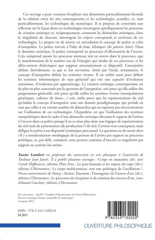 Cet ouvrage a pour vocation d'explorer une dimension particulièrement féconde de la relation entre les arts contemporains et les technologies du numérique. La poïèse renvoie à l'idée de fabriquer, et l'autopoïèse à ce qui se fait soi-même. L'hypothèse est que l'utilisation des systèmes autopoïétiques dans le cadre d'une démarche artistique décentre le rapport de l'artiste à l'oeuvre dans sa poïèse. L'artiste reste concepteur, mais délègue la poïèse à un dispositif systémique processuel.