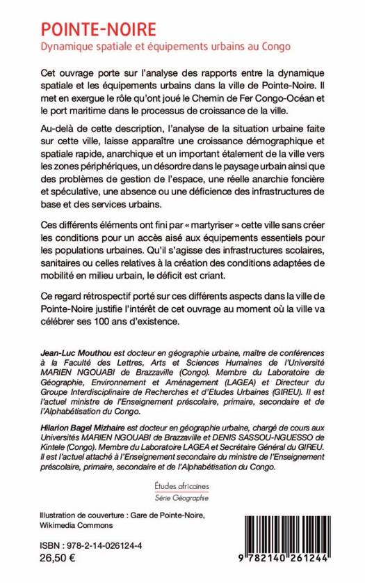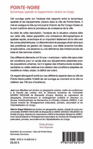 Cet ouvrage met en exergue le rôle qu'ont joué le Chemin de Fer Congo-Océan et le port maritime dans le processus de croissance de la ville de Pointe-Noire. L'analyse de la situation urbaine faite sur cette ville laisse apparaître une croissance démographique et spatiale rapide, anarchique et un important étalement de la ville vers les zones périphériques, un désordre dans le paysage urbain ainsi que des problèmes de gestion de l'espace, une réelle anarchie foncière et spéculative, une absence ou une déficience des infrastructures de base et des services urbains. Ces différents éléments ont fini par « martyriser » cette ville sans créer les conditions pour un accès aisé aux équipements essentiels pour les populations urbaines.