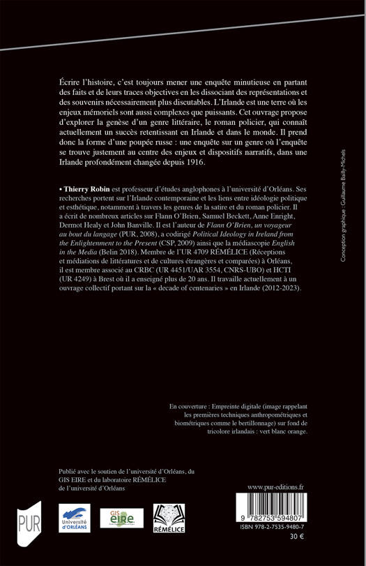 Écrire l’histoire, c’est toujours mener une enquête minutieuse en partant des faits et de leurs traces objectives en les dissociant des représentations et des souvenirs nécessairement plus discutables. L’Irlande est une terre où les enjeux mémoriels sont aussi complexes que puissants. Cet ouvrage propose d’explorer la genèse d’un genre littéraire, le roman policier, qui connaît actuellement un succès retentissant en Irlande et dans le monde. Il prend donc la forme d’une poupée russe : une enquête sur un genre où l’enquête se trouve justement au centre des enjeux et dispositifs narratifs, dans une Irlande profondément changée depuis 1916.