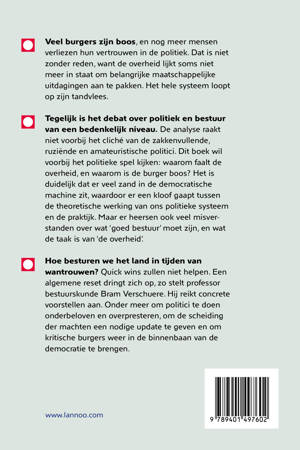 Veel burgers zijn boos, en nog meer mensen verliezen hun vertrouwen in de politiek. Dat is niet zonder reden, want de overheid lijkt soms niet meer in staat om belangrijke maatschappelijke uitdagingen aan te pakken. Het hele systeem loopt op zijn tandvlees. Tegelijk is het debat over politiek en bestuur van een bedenkelijk niveau. De analyse raakt niet voorbij het cliché van de zakkenvullende, ruziënde en amateuristische politici. Dit boek wil voorbij het politieke spel kijken: waarom faalt de overheid, en waarom is de burger boos? Het is duidelijk dat er veel zand in de democratische machine zit, waardoor er een kloof gaapt tussen de theoretische werking van ons politieke systeem en de praktijk. Maar er heersen ook veel misverstanden over wat 'goed bestuur' moet zijn, en wat de taak is van 'de overheid'. Hoe besturen we het land in tijden van wantrouwen? Quick wins zullen niet helpen. Een algemene reset dringt zich op, zo stelt professor bestuurskunde Bram Verschuere. Hij reikt concrete voorstellen aan. Onder meer om politici te doen onderbeloven en overpresteren, om de scheiding der machten een nodige update te geven en om kritische burgers weer in de binnenbaan van de democratie te brengen.