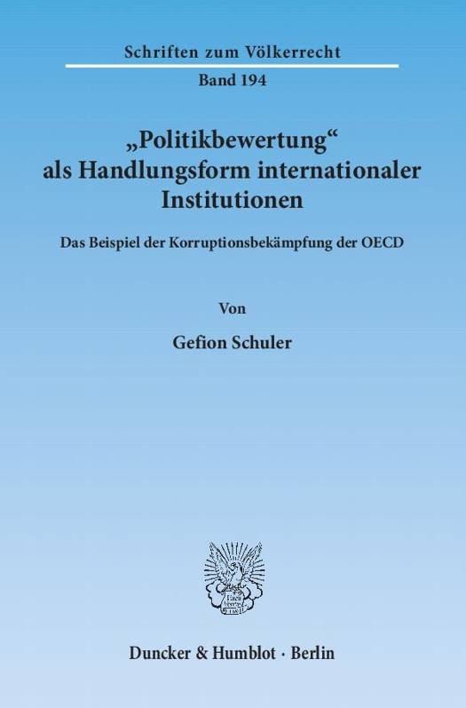 Gefion Schuler arbeitet den öffentlich-rechtlichen Zugang zum Recht internationaler Organisationen am Beispiel des Berichtsverfahrens der OECD zur Korruptionsbekämpfung auf. Hierzu befasst sie sich im ersten Teil mit dem Sachphänomen Korruption und untersucht das Berichtsverfahren der OECD aus Governance- und aus rechtswissenschaftlicher Perspektive. Im zweiten Teil erörtert die Autorin die Grundlagen zu einer rechtsdogmatischen Fassung des OECD-Berichtsverfahrens. Sie legt ein Konzept internationaler öffentlicher Gewalt dar und erörtert Handlungsformen als geeignete rechtstheoretische Konstrukte zur Fassung von Governance-Aktivitäten. Im dritten Teil konzipiert Schuler das OECD-Berichtsverfahren aus öffentlich-rechtlicher Perspektive als Handlungsform "Politikbewertung". Hierfür arbeitet sie die Definitionsmerkmale sowie die Elemente des Rechtsregimes dieser Handlungsform heraus.