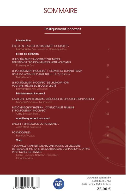 Le politiquement incorrect est dans l'air du temps. Serait-il en passe de devenir le nouveau mainstream discursif, après des décennies d'injonction au politiquement correct ? Que cachent l'exigence de « parler vrai » et l'exercice d'une liberté d'expression débridée ? En analyse de discours, ces questions sont généralement traitées dans l'ombre du politiquement correct. L'objectif du présent numéro est d'aborder le politiquement incorrect ex positivo, en éclairant certaines des pratiques propres à l'incorrection revendiquée.