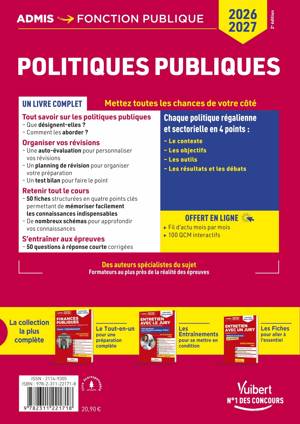Les dispositifs des politiques publiques, leurs acteurs et leurs enjeux sont au cœur de la culture administrative attendue aux concours, tant à l'écrit qu’à l'oral. Ce livre permet au candidat de connaître et d’appréhender les thématiques actuelles de ces politiques tout en l'incitant à avoir un avis éclairé et construit sur les débats en cours. Vous y trouverez :