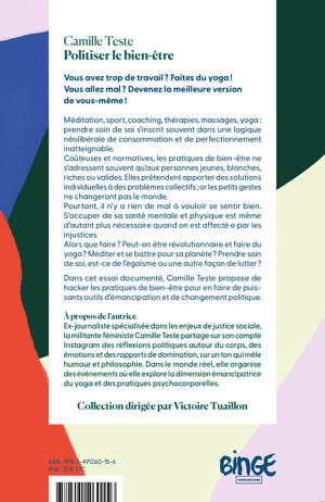 Méditation, sport, coaching, thérapies, massages, yoga : prendre soin de soi s’inscrit souvent dans une logique néolibérale de consommation et de perfectionnement inatteignable. Coûteuses et normatives, les pratiques de bien-être ne s’adressent souvent qu’aux personnes jeunes, blanches, riches ou valides. Elles prétendent apporter des solutions individuelles à des problèmes collectifs ; or les petits gestes ne changeront pas le monde. Pourtant, il n’y a rien de mal à vouloir se sentir bien. S’occuper de sa santé mentale et physique est même d’autant plus nécessaire quand on est affecté·e par les injustices. Alors que faire ? Peut-on être révolutionnaire et faire du yoga ? Méditer et se battre pour sa planète ? Prendre soin de soi, est-ce de l’égoïsme ou une autre façon de lutter ? Dans cet essai documenté, Camille Teste propose de hacker les pratiques de bien-être pour en faire de puissants outils d’émancipation et de changement politique. A PROPOS DE L'AUTRICE : Prof de yoga, militante féministe et ex-journaliste spécialisée dans les enjeux de justice sociale, Camille Teste se fait connaître grâce à son compte instagram @camille_teste. Sur celui-ci, elle partage des réflexions politiques autour du corps, des émotions et des rapports de domination, sur un ton qui mêle humour et philosophie. Dans le monde réel, elle organise des événements où elle explore la dimension émancipatrice du yoga et des pratiques psychocorporelles.