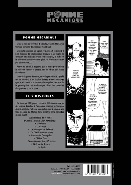 Ce volume de la Collection Osamu Tezuka's Dark Anthology contient 10 histoires inédites : Pomme Mécanique, Révolution, Le retour, La montagne du démon, Le diable entre en scène, Immaculée Conception, Yellow Dust, L'exécution a eu lieu à 3 heures, Route de nuit et Le kyste. Pomme Mécanique Yûsaku Shirakawa vit dans une petite ville isolée dans les montagnes appelée Inatake. Un jour, des événements des plus étranges se succèdent et Yûsaku constate les routes de sa ville désertes, laissant place à des chars d'assaut qui entourent la ville. Il est le seul à prendre conscience de ces événements anormaux et décide de mener sa propre enquête... Révolution Otani assiste à l'accouchement difficile de sa bien-aimée Yasué, qui finit par tomber dans le coma. À son réveil, Yasué ne reconnaît pas son mari et assure s'appeler Minako Hotta. Otani et Yasué décident de partir à la recherche du passé oublié de la femme pour démeler le mystère...