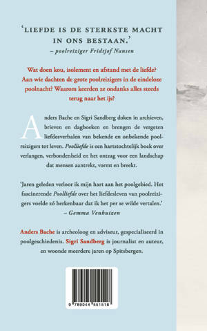 Anders Bache en Sigri Sandberg doken in archieven, brieven en dagboeken en brengen de vergeten liefdesverhalen van bekende en onbekende poolreizigers tot leven. Poolliefde is een hartstochtelijk boek over verlangen, verbondenheid en het ontzag voor een landschap dat mensen aantrekt, vormt en breekt.