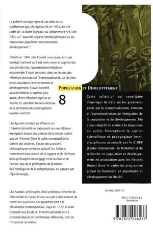 Cet ouvrage reprend une série de six conférences que Léo Apostel fit, en 1993, dans le cadre de la chaire Francqui, au département SPED de l'UCL. Le philosophe essaie d'établir des liaisons interdisciplinaires entre l'écologie, la démographie et la théorie du développement.