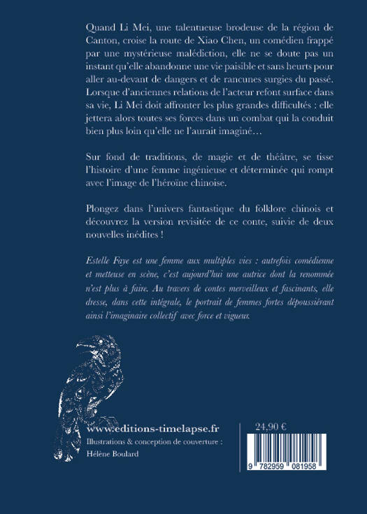 Quand Li Mei, une talentueuse brodeuse de la région de Canton, croise la route de Xiao Chen, un comédien frappé par une mystérieuse malédiction, elle ne se doute pas un instant qu'elle abandonne une vie paisible et sans heurts pour aller au-devant de dangers et de rancunes surgies du passé. Lorsque d'anciennes relations de l'acteur refont surface dans sa vie, Li Mei doit affronter les plus grandes difficultés : elle jettera alors toutes ses forces dans un combat qui la conduit bien plus loin qu'elle ne l'aurait imaginé...Sur fond de traditions, de magie et de théâtre, se tisse l'histoire d'une femme ingénieuse et déterminée qui rompt avec l'image de l'héroïne chinoise.Plongez dans l'univers fantastique du folklore chinois et découvrez la version revisitée de ce conte, suivie de deux nouvelles inédites !