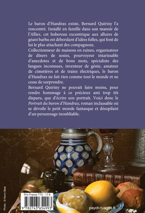 Le baron d'Handrax existe, Bernard Quiriny l'a rencontré. Installé en famille dans son manoir de l'Allier, ce hobereau excentrique aux allures de géant barbu est débordant d'idées folles, qui font de lui le plus attachant des compagnons. Collectionneur de maisons en ruines, organisateur de dîners de sosies, pourvoyeur intarissable d'anecdotes et de bons mots, spécialiste des langues inconnues, inventeur de génie, amateur de cimetières et de trains électriques, le baron d'Handrax ne fait rien comme tout le monde et ne cesse de surprendre. Bernard Quiriny ne pouvait faire moins, pour rendre hommage à ce précieux ami trop tôt disparu, que d'écrire son portrait. Voici donc un roman inclassable où se dévoile le petit monde fantasque et désopilant d'un personnage inoubliable.