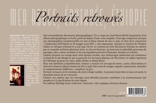 Une extraordinaire découverte photographique ! Il y a vingt ans, José-Marie Bel fit l’acquisition d’un album photographique en Italie, point de départ d’une vaste enquête. L’ouvrage comportait presque 300 photographies exceptionnelles en noir et blanc datant de 1900 à 1936. Le titre de la couverture « Fondazione dell’Impero et IX maggio anno XIV », sans équivoque, marque la création de l’Empire italien en Afrique orientale le 9 mai 1936, l’A.O.I. Le contenu de cette découverte fortuite ne montre pas sa conquête militaire glorieuse mais un étonnant et splendide panorama de paysages, sites, scènes animées et de remarquables portraits d’hommes, femmes et enfants. L’auteur propose un voyage dans cette époque révolue, une authentique immersion qui commence au bord de la mer Rouge et qui se poursuit sur les hauts plateaux de l’Érythrée, en région tigréenne de l’Éthiopie jusqu’au lac Tana, Addis Abeba et même Harar. Pour une meilleure compréhension, l’auteur a enrichi cet ouvrage de textes, cartes, illustrations et d’extraits d’autres albums datant de 1870 à 1938. Portraits retrouvés est le troisième de cette trilogie inédite ; le premier étant Sites et Lieux retrouvés, le deuxième Scènes de vie retrouvées. Un sublime florilège d’une collection « Harcourt » des tropiques africains d’antan.