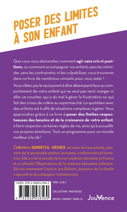 Que vous vous demandiez comment agir sans cris ni punitions, ou comment accompagner vos enfants sans les intimider, sans les contraindre, ni les culpabiliser, vous trouverez dans ce livre de nombreux conseils pour vous aider ! Vous n’êtes pas le seul parent à être désemparé face au comportement de votre enfant qui ne veut pas venir manger ni aller se coucher, qui a du mal à gérer la frustration ou qui fait des crises de colère au supermarché. Le quotidien avec des enfants est truffé de situations complexes à gérer. Vous apprendrez grâce à ce livre à poser des limites respectueuses des besoins et de la croissance de votre enfant, à faire respecter certaines règles de vie, ainsi qu’à accueillir vos propres émotions. Tout un programme pour un monde meilleur à la clé !