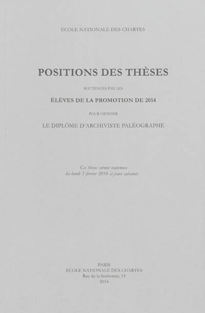 Positions des thèses soutenues par les élèves de la promotion de 2014 pour obtenir le diplôme d'archiviste paléographe