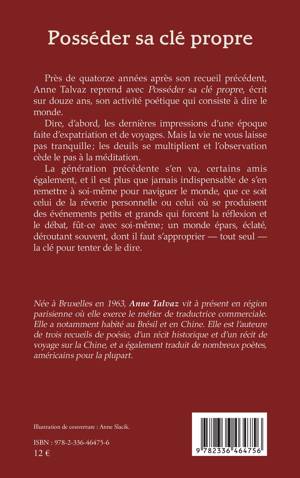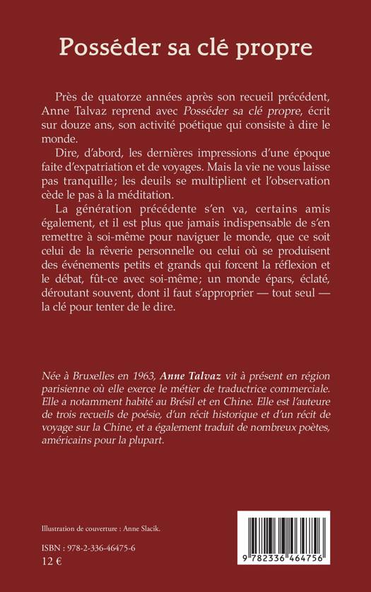 Près de quatorze années après son recueil précédent, Anne Talvaz reprend avec Posséder sa clé propre, écrit sur douze ans, son activité poétique qui consiste à dire le monde. Dire, d'abord, les dernières impressions d'une époque faite d'expatriation et de voyages. Mais la vie ne vous laisse pas tranquille; les deuils se multiplient et l'observation cède le pas à la méditation. La génération précédente s'en va, certains amis également, et il est plus que jamais indispensable de s'en remettre à soi-même pour naviguer le monde, que ce soit celui de la rêverie personnelle ou celui où se produisent des événements petits et grands qui forcent la réflexion et le débat, fût-ce avec soi-même; un monde épars, éclaté, déroutant souvent, dont il faut s'approprier - tout seul - la clé pour tenter de le dire.