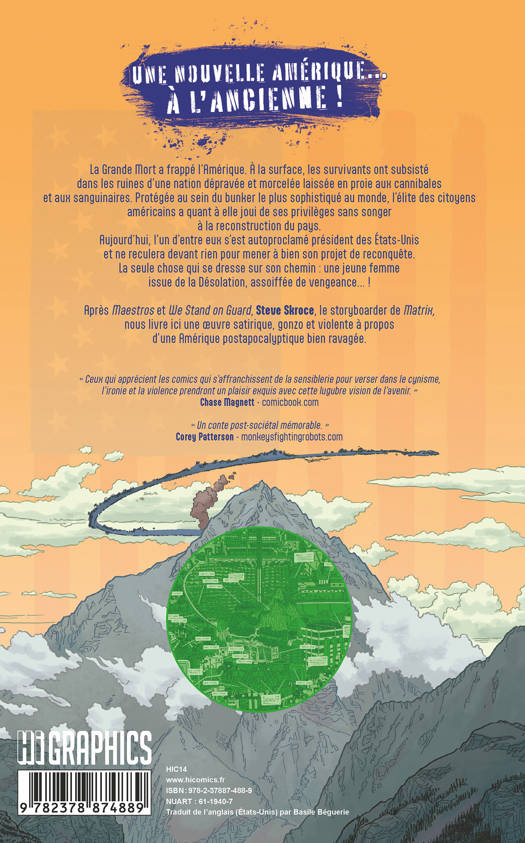 Steve Skroce, le storyboarder de Matrix, livre une satire politique furieusement corrosive qui évoque autant les imaginaires de Mad Max, Borderlands ou Idiocracy en s'inscrivant dans la générosité graphique du Shaolin Cowboyde Geof Darrow.